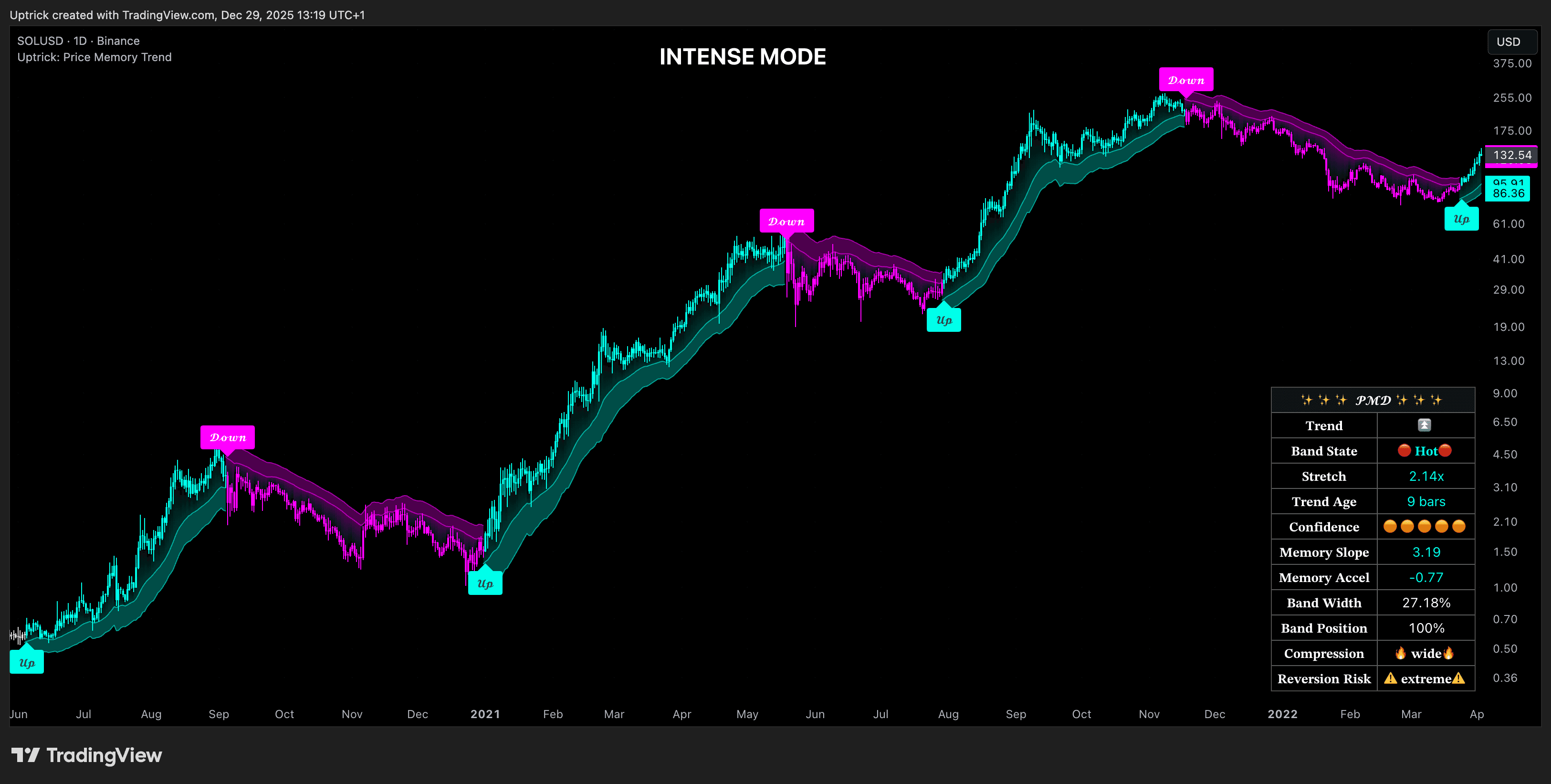 Uptrick: Price Memory Trend is a custom indicator designed to detect directional shifts and volatility changes using a non-traditional price memory approach. Unlike moving average systems, it builds a dynamic memory of price that adapts gradually over time, allowing it to detect significant deviations and trend transitions with reduced noise.