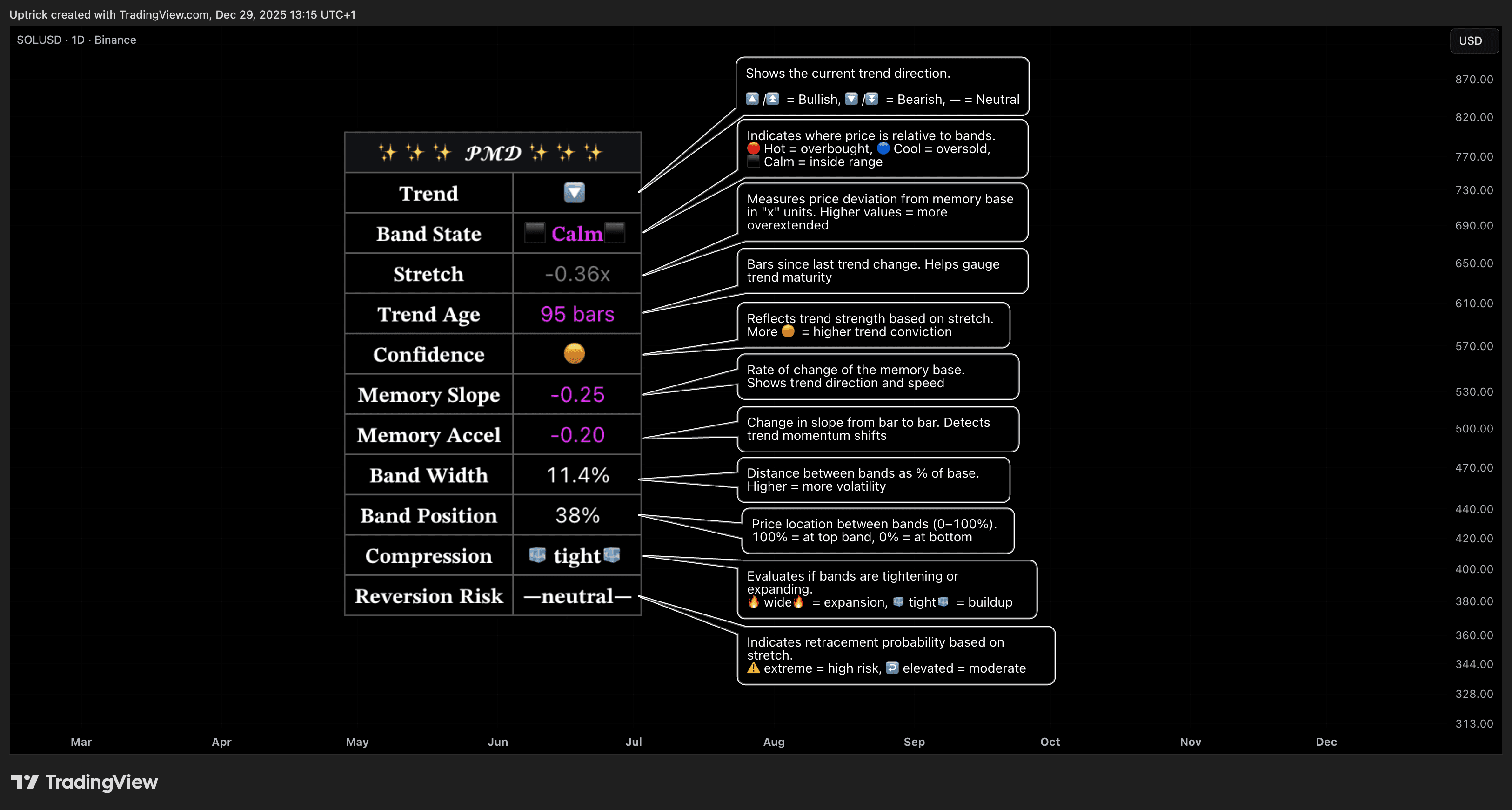 > Lower Band = memory base - (smoothed deviation × band multiplier)ATR-based extensions can optionally be drawn around these bands for added visual structure.