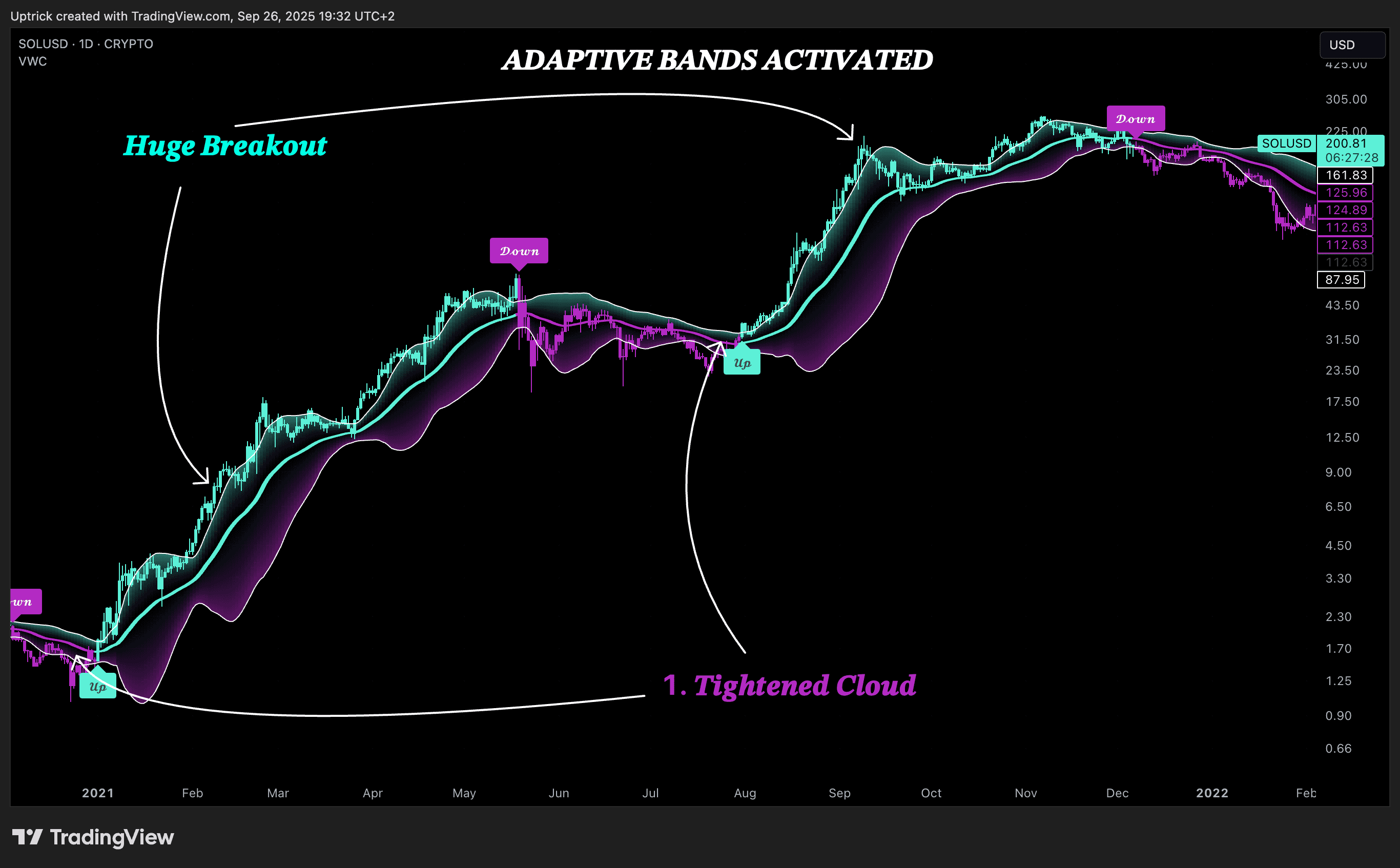 ➤ Short Signal: Triggered when the close crosses below the lower adaptive band.